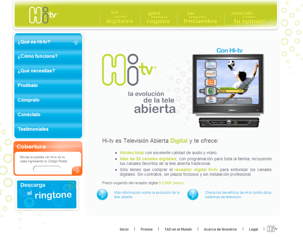 Hi-tv es un sistema que se roba los dichosos canales del espectro digital. Ópera en la ilegalidad según televisa, pero eso demuestra que está dando patadas de ahogado. Ya que telmex y tv azteca en alianza eliminaron la ley televisa. Es por eso que ahora hay ley tv azteca. Que se acaparo todos los derechos de la señal digital. Además bien se sabe que ya viene un apagón analógico en el cual se eliminan los canales abiertos obligándonos a comprar pantallas de plasma o decodificadores como el hi tv, es por eso que tv azteca se adelanto y metió sus canales en HD (HIGH DEFINITION) que sólo se ven en las pantallas nuevas y que se ve cortada la señal en su aparato. A ambas empresas les conviene adelantarse a esto, ya que como en estados unidos (que cuando hubo apagón analógico tiraron todas sus televisiones) hay ya tecnología digital, ellos quieren unirse al negocio del espectro digital. Y debo admitir que sí se ven mejor los canales en hd pero como aquí vamos atrasados. La señal llega bien por unos momentos y luego se pixelea. Por ejemplo en los partidos de futbol. Se ven bien un momento y luego empieza a verse mal. Pues ya después veremos a televisa con su aparato decodificador. Además que cuando pase en México el apagón analógico, hasta cadenatres va a sacar su decodificador para dar batalla al duopolio que controla la televisión abierta, que no deja pasar más canales ni más opciones de entretenimiento. Que no deja pasar a importantes empresas que quieren hacer televisión abierta ya que ambos hacen sus reuniones a puerta cerrada. Pues mientras halla un canal que no sea de tv azteca y televisa estaría bien verlo para ya descansar de lo de siempre, de novelas espantosas, de caricaturas repetidas y viejas, de noticieros sin noticias reales,de programas de revista matutina idiotas con conductores pendejos y que sólo están hay por su linda cara,de programas de concursos asquerosos, de programas sabátinos que son una verdadera mierda, de realitys dominicales hechos con las patas que no se les entiende nada y sólo hacen que la gente mandé mensajes a lo pendejo y que a final de cuentas ganan sólo los que se cogen a sus productoras o las que se cogen a los productores(sí no vean un reality de domingos y vean que los finalistas son puros niños bonitos y que siempre gana el que mejor se coge a los productores). En fin otra opción. Al menos en el hi tv sí te aburrer pones antena neox y te poner a ver una buena serie española. Y ya dejar de ver la miérda de siempre.