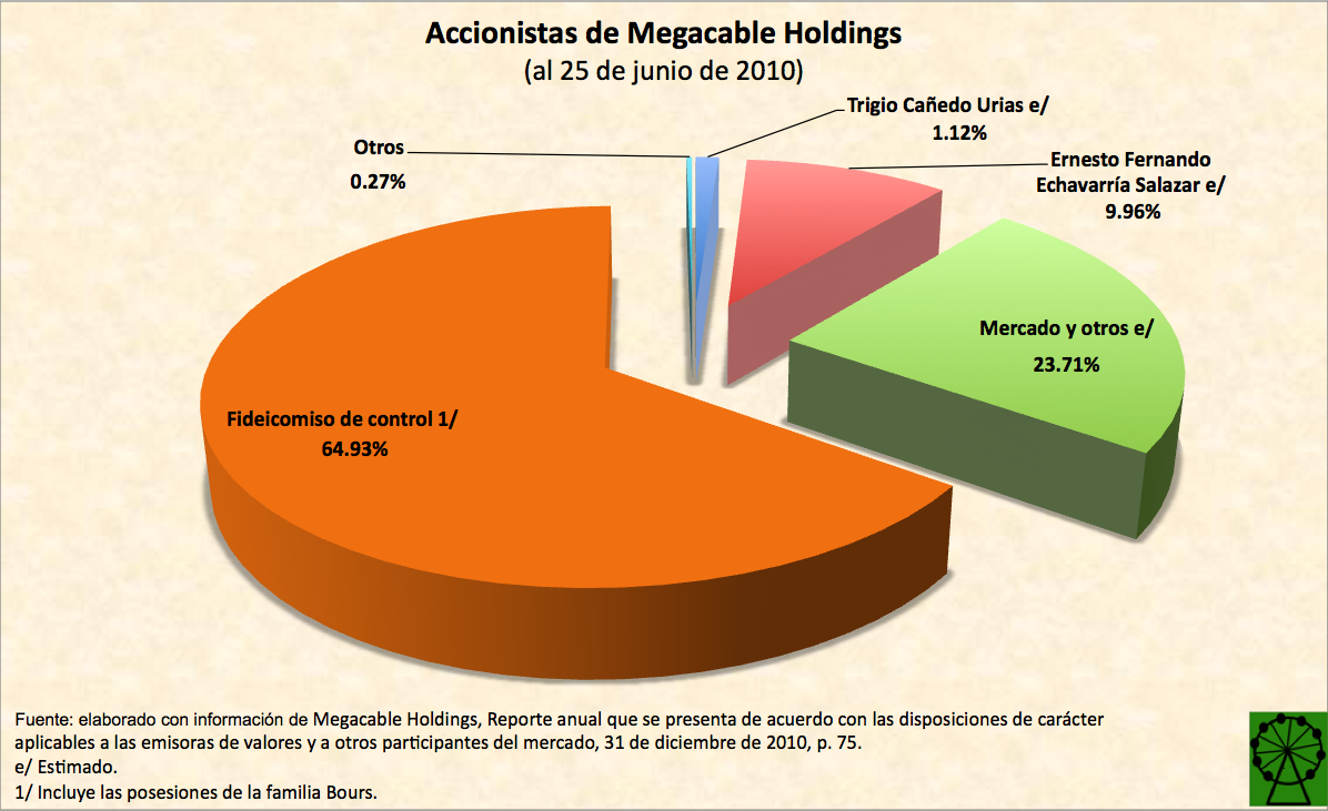 | e/ Estimado. 1/ Incluye las posesiones de la familia Bours. Fuente: Megacable Holdings, Reporte anual que se presenta de acuerdo con las disposiciones de carácter aplicables a las emisoras de valores y a otros participantes del mercado, 31 de diciembre de 2010, p. 75. |
