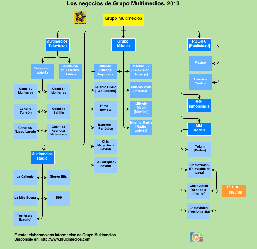 Posted in Archivos del cuarto poder, Diagramas | Etiquetado: acceso a Internet, Cablevisión Monterrey, Canal 12 Monterrey, Canal 64 Monterrey, Grupo Multimedios, inmobiliaria, Milenio, Milenio Diario, Milenio Televisión, Milenio.com, multimedios, POL-ICF, publicidad, radio, telefonía fija, televisión de paga, Telum, TVI | Leave a Comment »