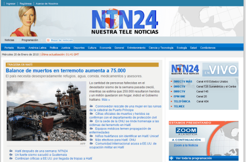 Detalle del portal de la señal de televisión NTN24, Nuestra Tele Noticias 24.